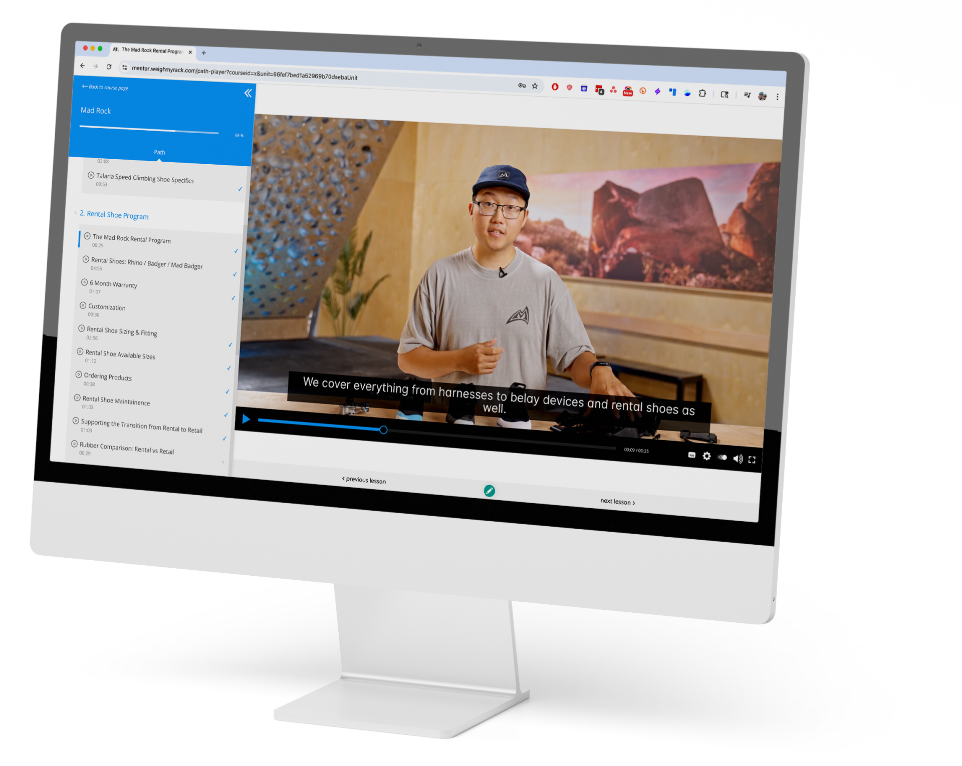 Mentor is a climbing‑specific training platform that delivers your product education to gym staff, retail buyers, and your rep team so you can stop repeating the same information and start seeing consistent, on‑brand customer experiences.